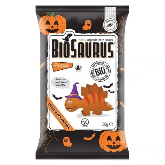 BIOSAURUS Chrupki kukurydziane Dinozaury HALLOWEEN o smaku pizzy BIO 50 g