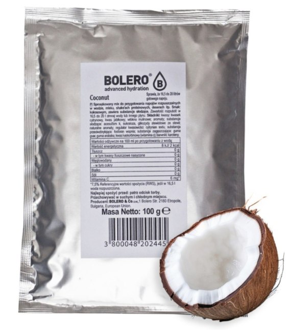 Bolero Coconut to aromatyczny proszek do przygotowania napoju o smaku kokosowym, dostarczany w opakowaniu o wadze 100 gramów. Stanowi on idealne rozwiązanie dla osób poszukujących niskokalorycznego produktu, który świetnie sprawdzi się jako dodatek do wody, kawy, jogurtu, koktajli oraz deserów - również tych w wersji fit.